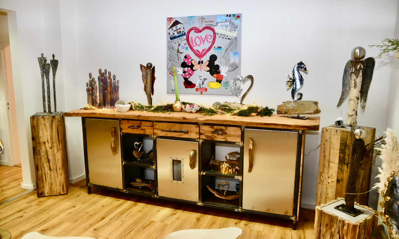 Wir, Iara und Frank Fidrowicz, fertigen individuelle Objekte - auch nach eigenen Wünschen - in unserer außergewöhnlichen Kunstschmiede. Besuchen Sie unseren Fissimo Ausstellungs-Store und großen Schmiedegarten in Herford oder unseren Fissimo-Sylt Store in Westerland und genießen Sie die außergewöhnliche Atmosphäre. Auch im ConceptStore "Komplizen" in Lemgo befindet sich zum Stöbern eine kleine Verkaufsfläche mit einer eingeschränkten Auswahl unserer handgefertigten Produkte. Siehe das letzte Foto in der Bilderschau.